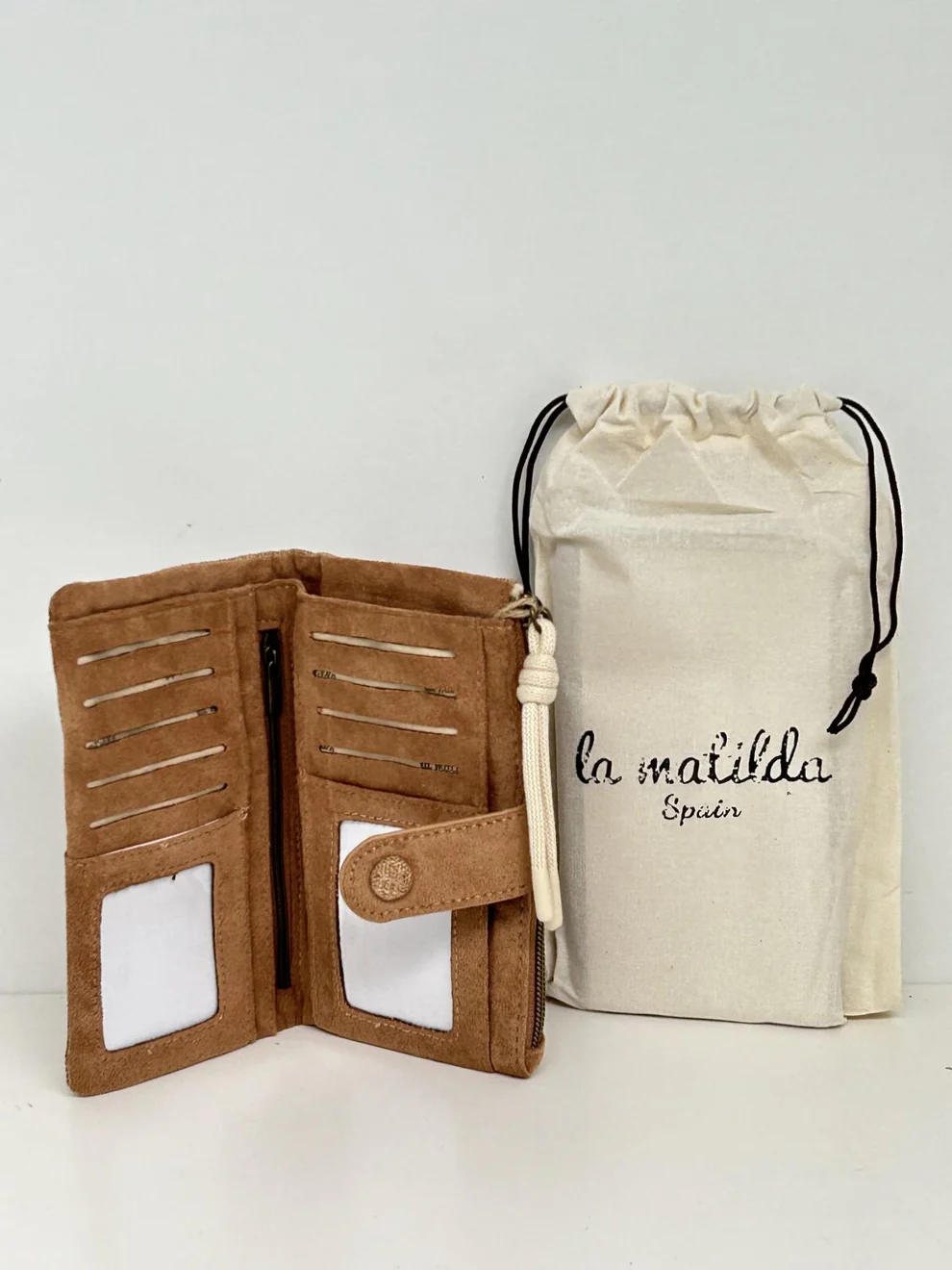 Cartera de tela con forro interior y cierre de cremallera. Ideal para billetes y tarjetas.